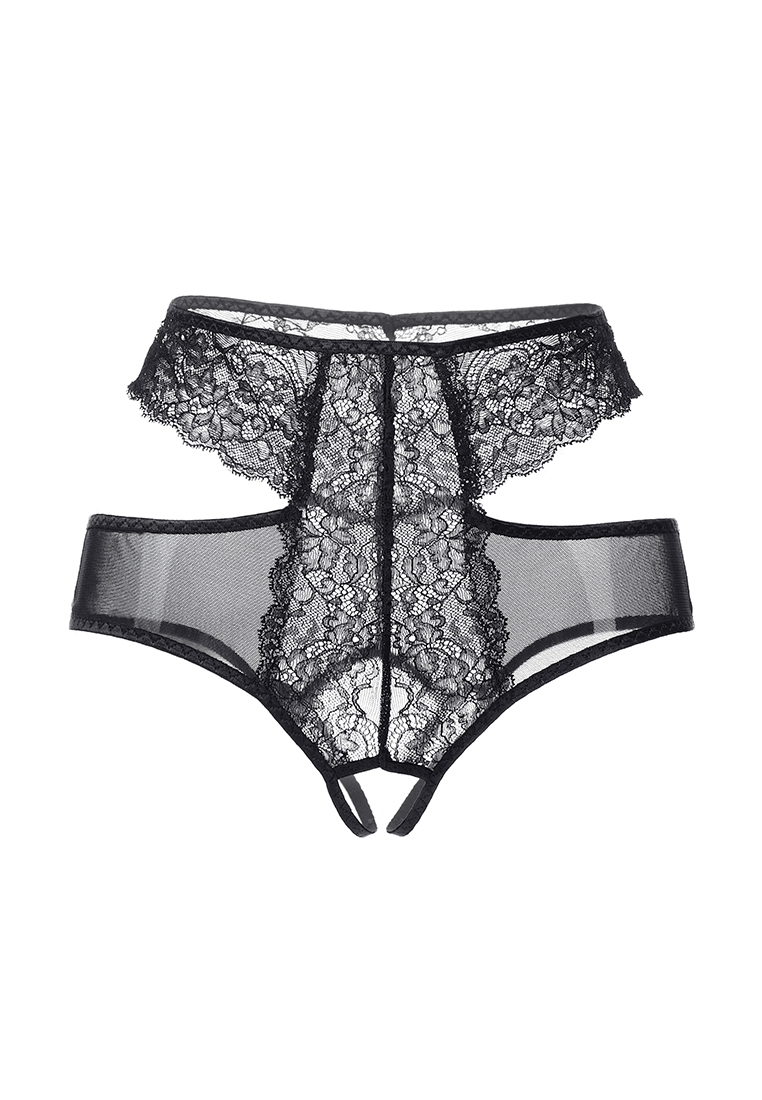 Эротические трусики из эластичной сетки со вставками кружева, с декоративными вырезами по бокам. Высокая посадка.