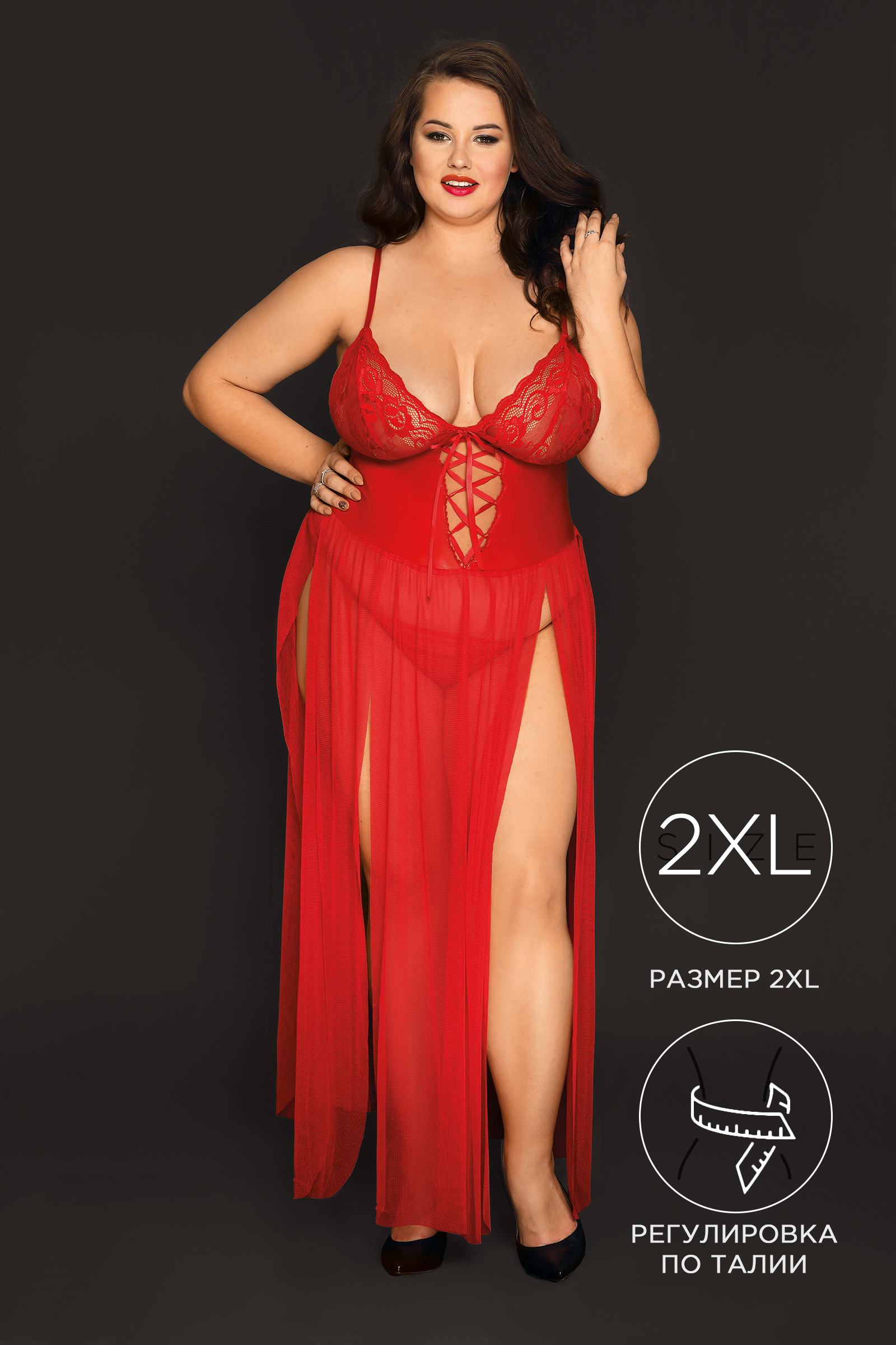 Длинная комбинация и Т-стринги Кэнди Гёрл Tabitha создают wow-эффект. Кружевной лиф визуально добавляет объем и поддерживает грудь. Вставки из трикотажной ткани и лаковой кожи плотно обхватывают талию, создавая точеный силуэт, а шнуровка и регулируемые бретели помогают достичь комфортной посадки. Четыре высоких продольных разреза струящейся юбки из полупрозрачной сетки зрительно удлиняют ноги и соблазнительно приоткрывают колени, бедра и ягодицы. Комбинация для дивы с шикарными формами идеальна для танца, романтического вечера или в качестве домашнего наряда.