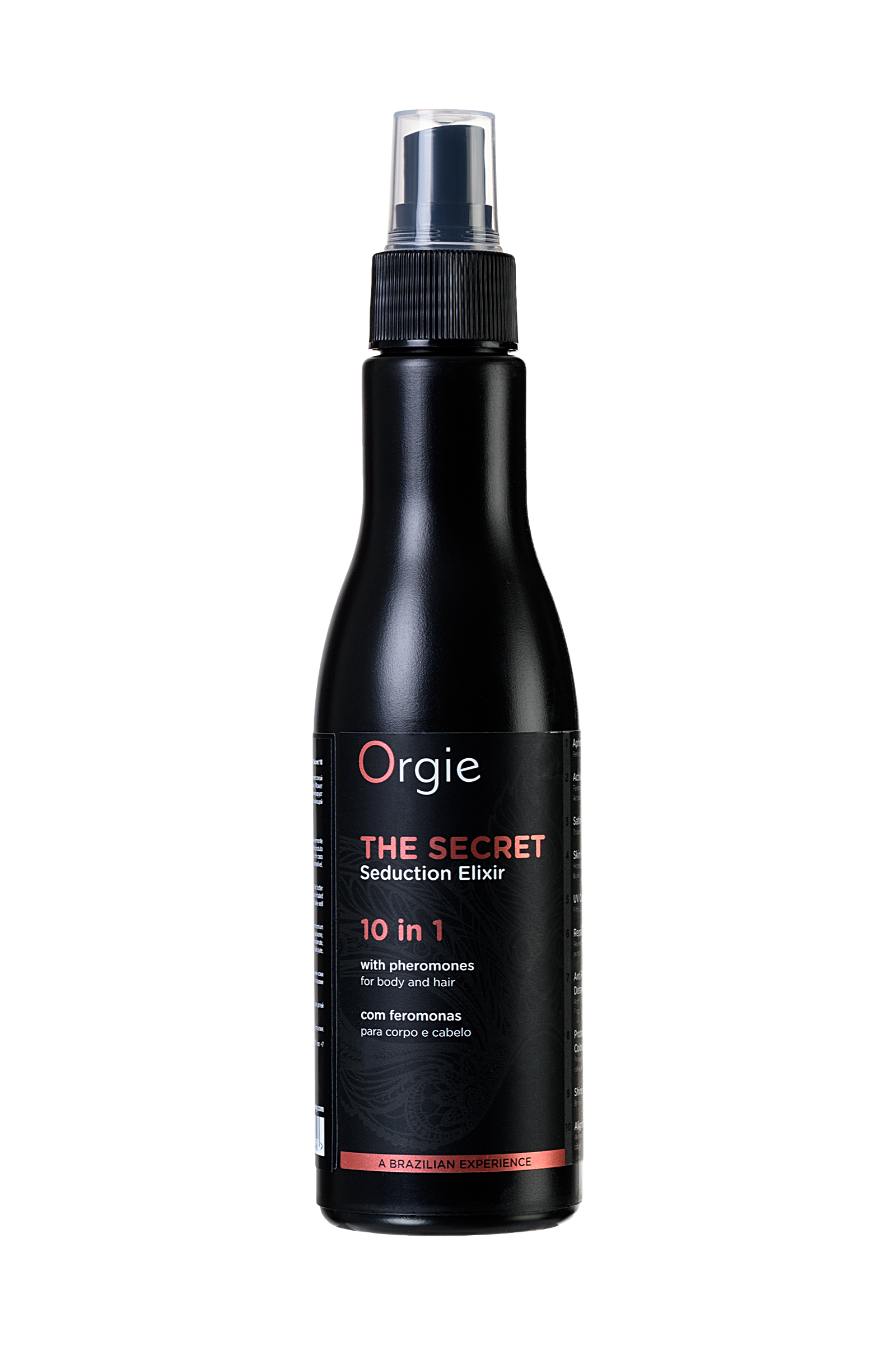 The Secret Elixir 10 в 1 от бренда Орджи — это парфюмированный бальзам для волос и тела с активными феромонами и афродизиаками. Легкая консистенция, очень стойкий возбуждающий аромат и эффект соблазнения. У этого продукта есть 10 причин, почему вы должны иметь его всегда в своей косметичке: • сладковато-ванильный возбуждающий аромат• содержит активные феромоны• придает шелковистость волосам и коже• увлажняет кожу• защищает волосы от ультрафиолета• восстанавливает посеченные кончики• волосы легко расчесываются и не электризуются• придает блеск и мягкость• закрывает чешуйки волос• выполняет роль термозащиты Способ применения: Нанесите парфюмированный спрей на волосы и кожу, чтобы ощутить аромат, увлажненность и ухоженность кожи и волос и притягательность в глазах мужчин. Аромат держится до 12 часов на волосах, раскрываясь постепенно при прикосновении.