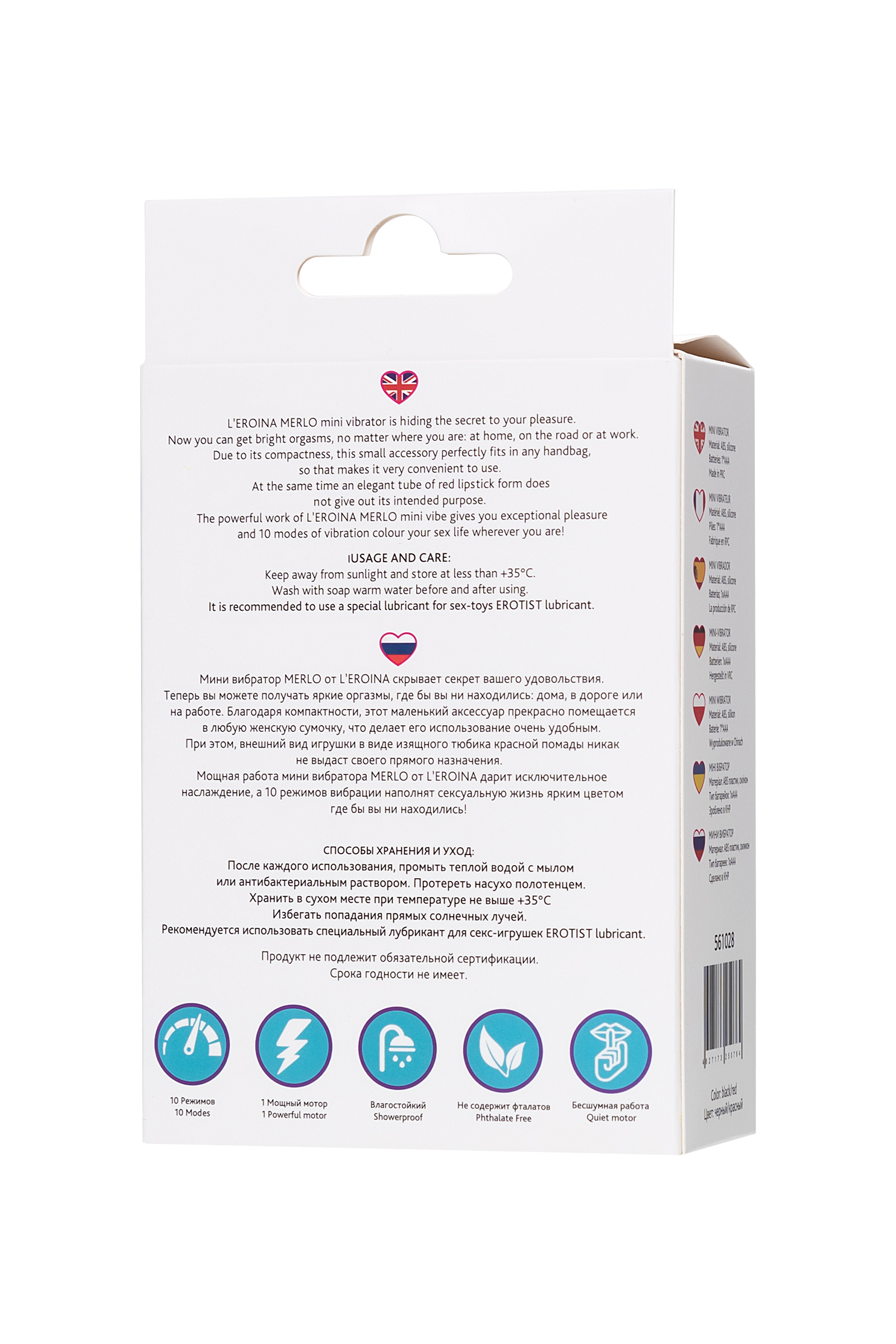 Мини вибратор MERLO от бренда Лероина скрывает секрет вашего удовольствия. Теперь вы можете получать яркие оргазмы, где бы вы ни находились: дома, в дороге или на работе. Благодаря компактности, этот маленький аксессуар прекрасно помещается в любую женскую сумочку, что делает его использование очень удобным. При этом, внешний вид игрушки в виде изящного тюбика розовой помады никак не выдаст своего прямого назначения. Мощная работа мини вибратора MERLO от L’EROINA дарит исключительное наслаждение, а 10 режимов вибрации наполнят сексуальную жизнь ярким цветом где бы вы ни находились! Общая длина: 10,5 см 10 режимов Бесшумная работа Мощный мотор Рекомендуем использовать до и после применения - дезинфицирующее средство для игрушки чтобы обеспечить длительное скольжение и комфорт интимных отношений, рекомендуем использовать смазку на водной основе. Хранить при температуре не выше 35 градусов, избегать попадания прямых солнечных лучей. Перед хранением стимулятор необходимо хорошо просушить