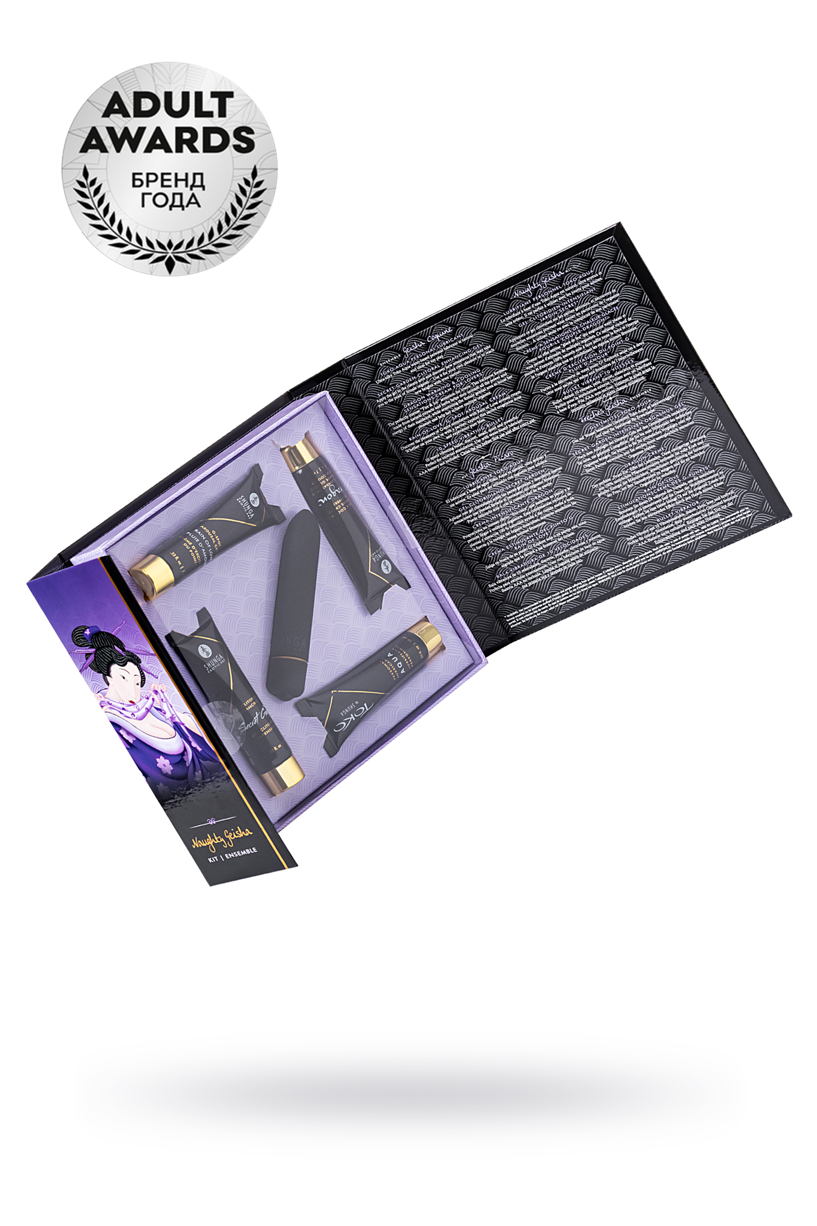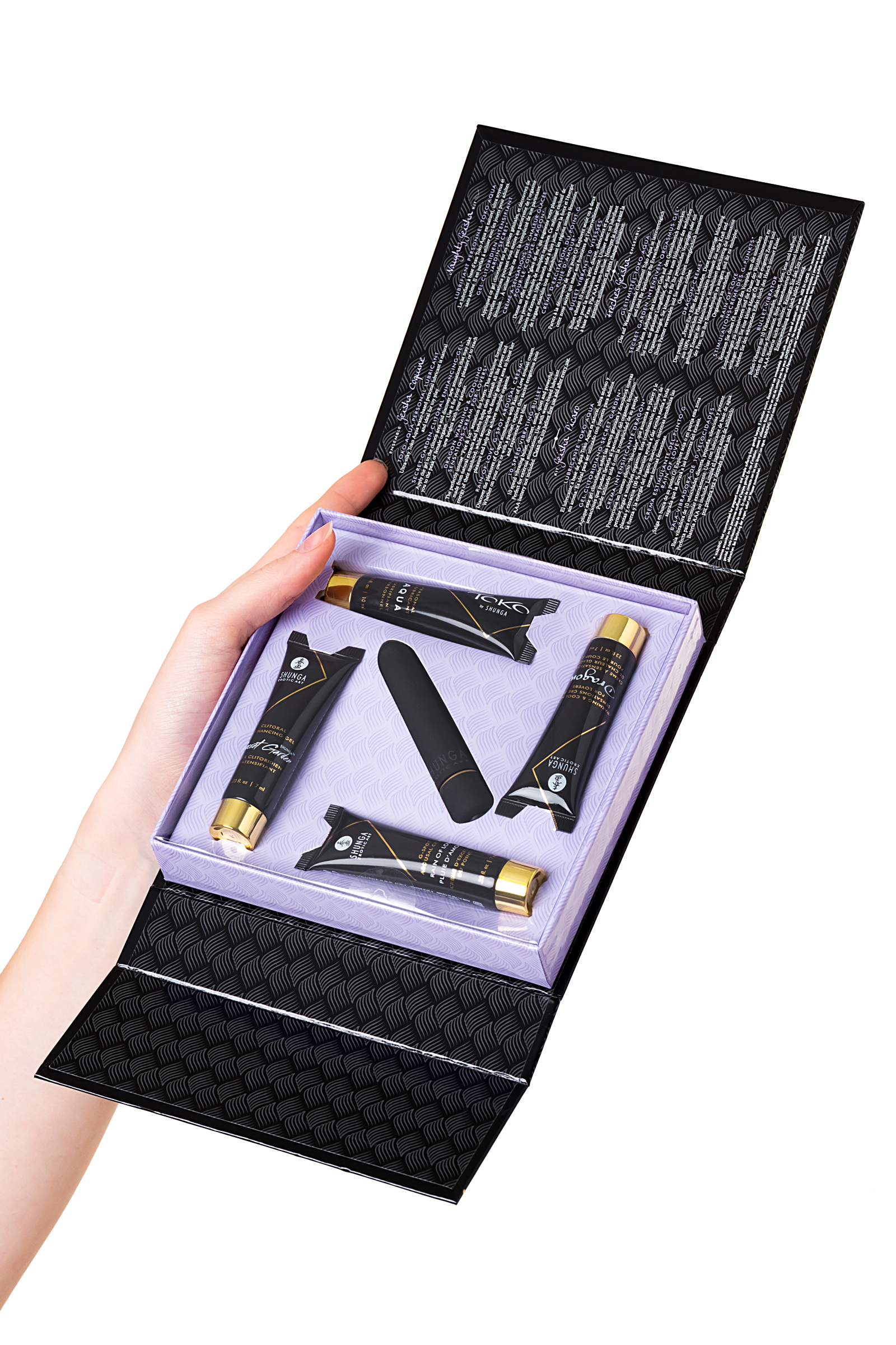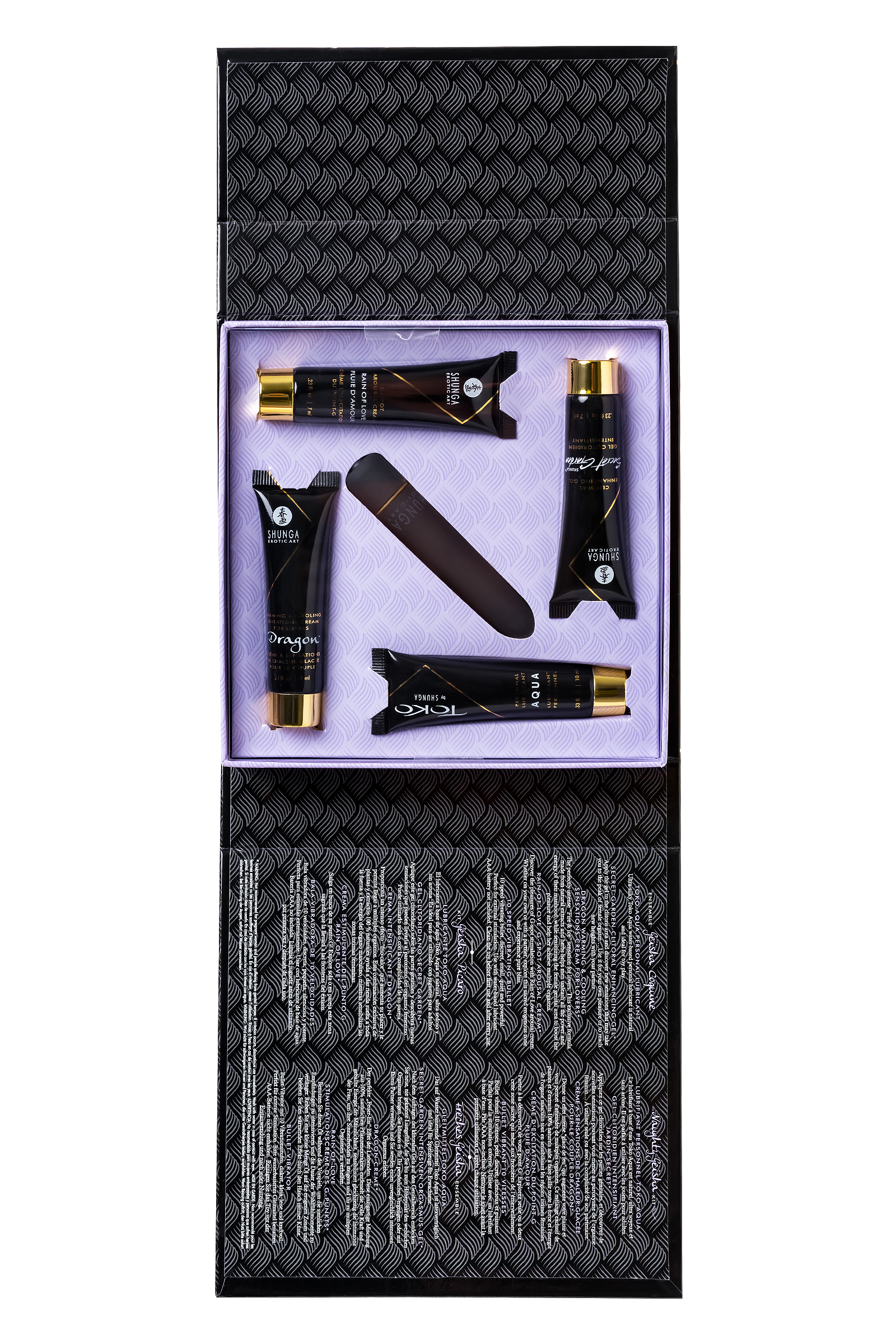 В набор входит:• Лубрикант на водной основе - 10 мл• Возбуждающий крем для женщин SECRET GARDEN (Тайный сад), 7 мл• Крем DRAGON (Дракон) - 7 мл• Крем для стимуляции точки G RAIN OF LOVE (Дождь любви), 7 мл• 10-скоростная вибропуля, (Батарейки ААА не входят в комплект)Коллекция миниатюрных продуктов поможет вам изучить и разбить все табу. Ничто так ни разжигает желания как интерес исследовать жажду вашего тела или жажду тела вашего любовника.Идеально подходит для вашей сексуальной жизни, в качестве подарка или прекрасного начала для исследования продукции Shunga.