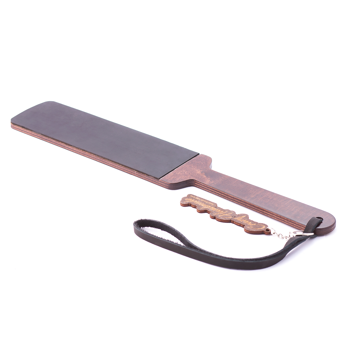 Паддл Крэйзи хенд-мейд с кожаным покрытием комбинированный с деревом. Технически прост в применении и относительно неопасен, хотя при сильном воздействии наносит очень чувствительные шлепки. Общая длина — 38 см. Длина ударной части — 20 см. Ширина — 6,5 см. Натуральная кожа