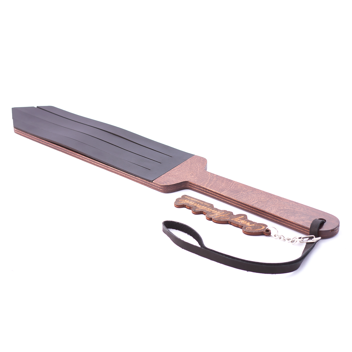 Паддл Крэйзи хенд-мейд с кожаным покрытием комбинированный с деревом. Технически прост в применении и относительно неопасен, хотя при сильном воздействии наносит очень чувствительные шлепки. Общая длина — 38 см. Длина ударной части — 20 см. Ширина — 6,5 см. Натуральная кожа