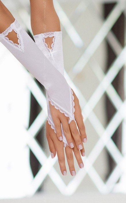 Перчатки атласные, украшенные стразами и кружевными элементами декора. Вырезы в виде треугольников у основания.