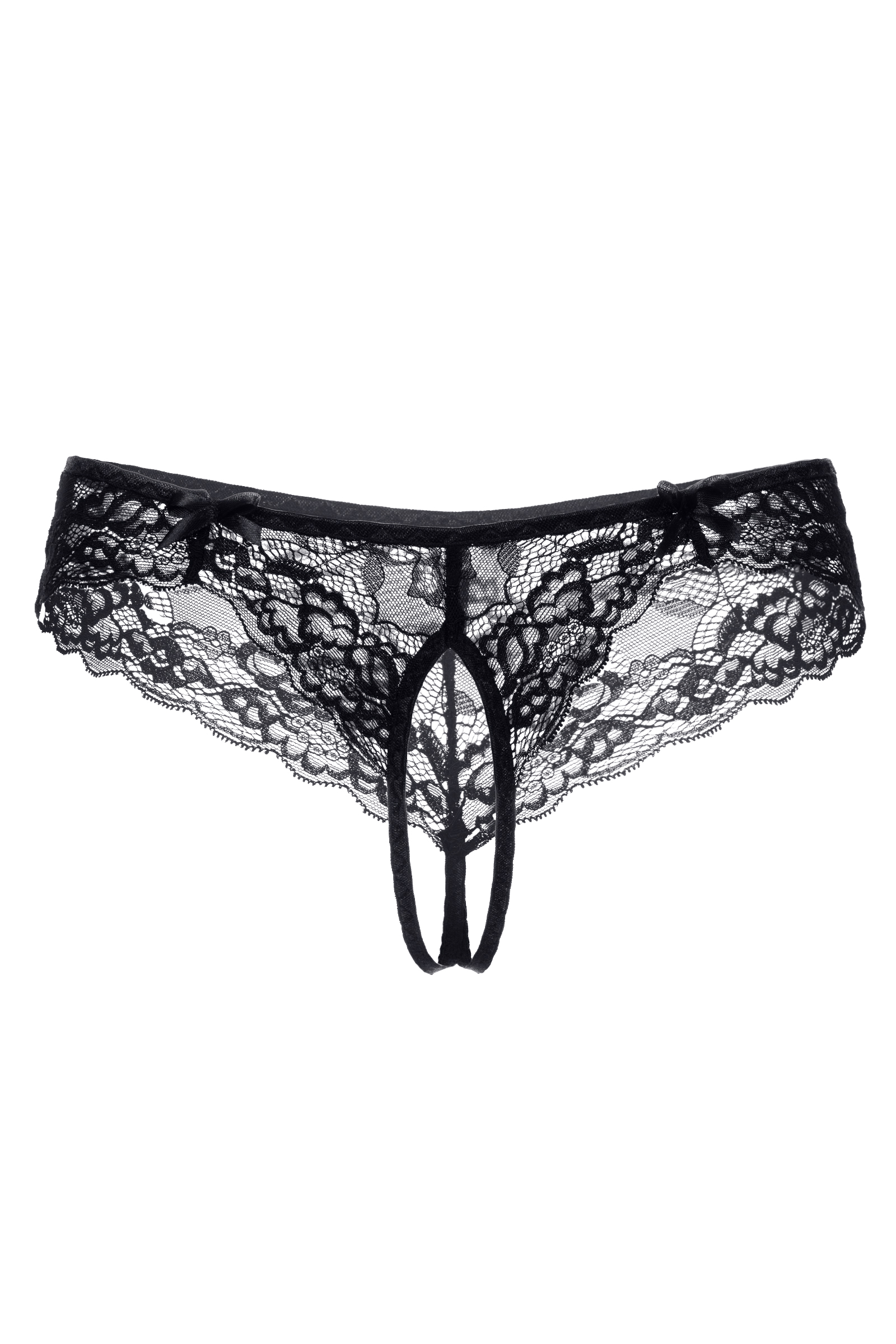 Эротические трусики кружевные, эластичные. Спереди декорированы атласными бантиками. Свободный кружевной край.