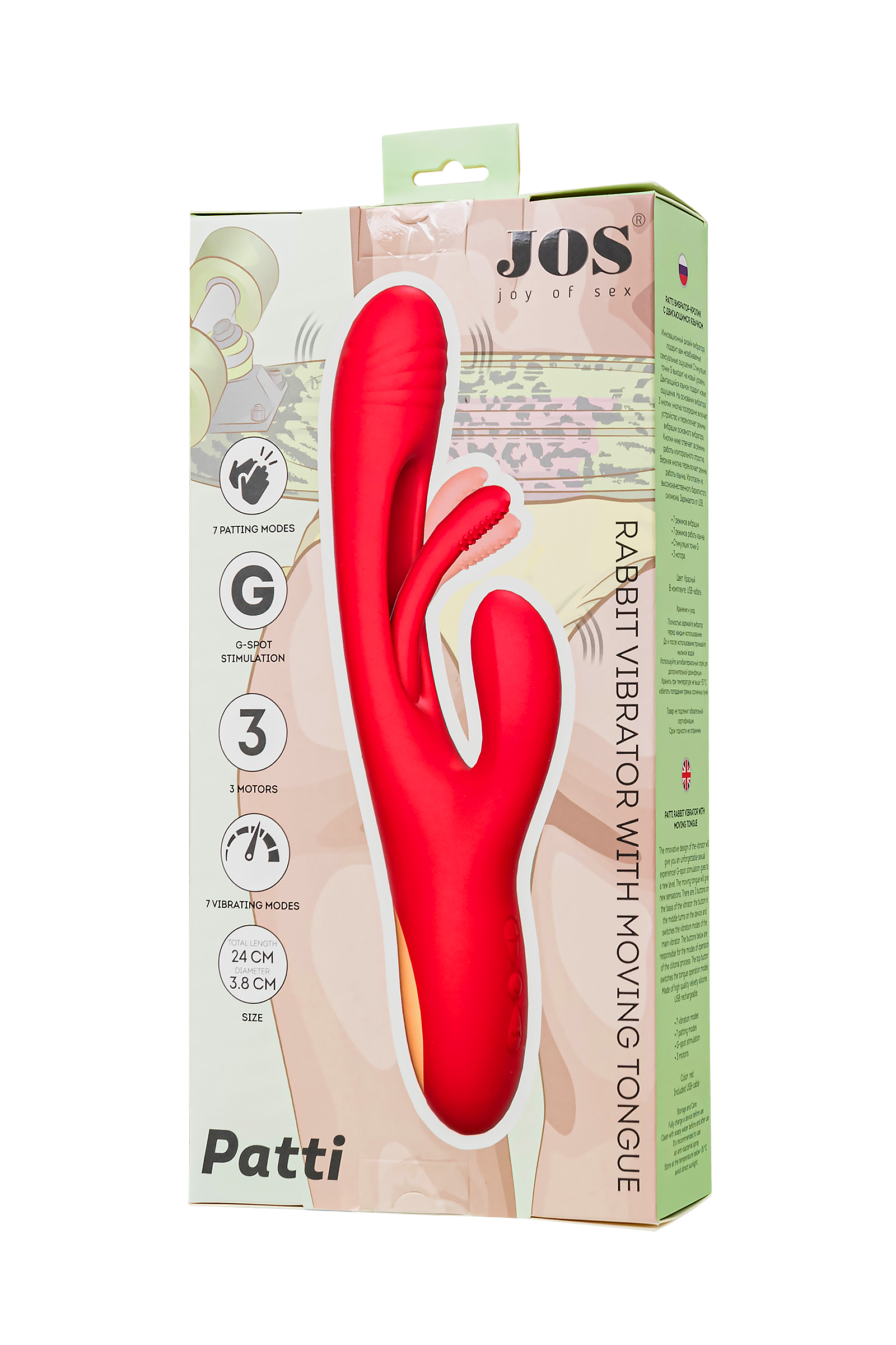 Погрузитесь в мир инновационных ощущений с вибратором с двигающимся язычком PATTI от самого необыкновенного бренда Джос! Этот невероятный технологичный дизайн поднимет стимуляцию точки G на абсолютно новый уровень. Двигающийся язычок внутри вагинальной части точечно вибрирует непосредственно на зоне G, погружая вас в водоворот удовольствия. А клиторальный отросток в это время может ласкать вас разнообразными волнами вибрации. Тройное удовольствие гарантирует оргазм с максимальным уровнем экстаза. Управляйте своим наслаждением с легкостью! Три кнопки на основании вибратора контролируют каждый аспект удовольствия. Серединная кнопка включает устройство и переключает режимы основного вибратора. Кнопки ниже управляют режимами клиторального отростка. Верхняя кнопка изменяет режимы работы язычка. PATTI выполнен из высококачественного бархатистого силикона, обеспечивая максимальный комфорт. Заряжается от USB, что делает использование еще более удобным. Простое управление тремя кнопками гарантирует, что каждая функция будет под вашим контролем. Не забывайте о правильном хранении и уходе за PATTI, чтобы он всегда оставался вашим верным спутником. Используйте лубриканты только на водной основе. Перед первым использованием полностью зарядите вибростимулятор. После использования промойте его мыльной водой и дезинфицируйте антибактериальным спреем, чтобы сохранить его гигиеничность и долговечность. Технические характеристики: 7 режимов вибрации,7 режимов работы язычка,стимуляция точки G,3 мотора,общая длина: 24 см,диаметр: 3,8 см Рекомендуем использовать до и после применения - дезинфицирующее средство для игрушки чтобы обеспечить длительное скольжение и комфорт интимных отношений, рекомендуем использовать смазку на водной основе. Хранить при температуре не выше 35 градусов, избегать попадания прямых солнечных лучей. Перед хранением стимулятор необходимо хорошо просушить